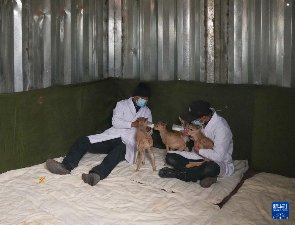 巡山隊員在可可西里卓乃湖保護站給救助的小藏羚羊喂奶(7月2日攝)。