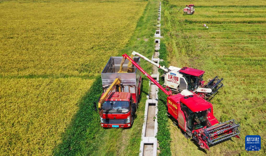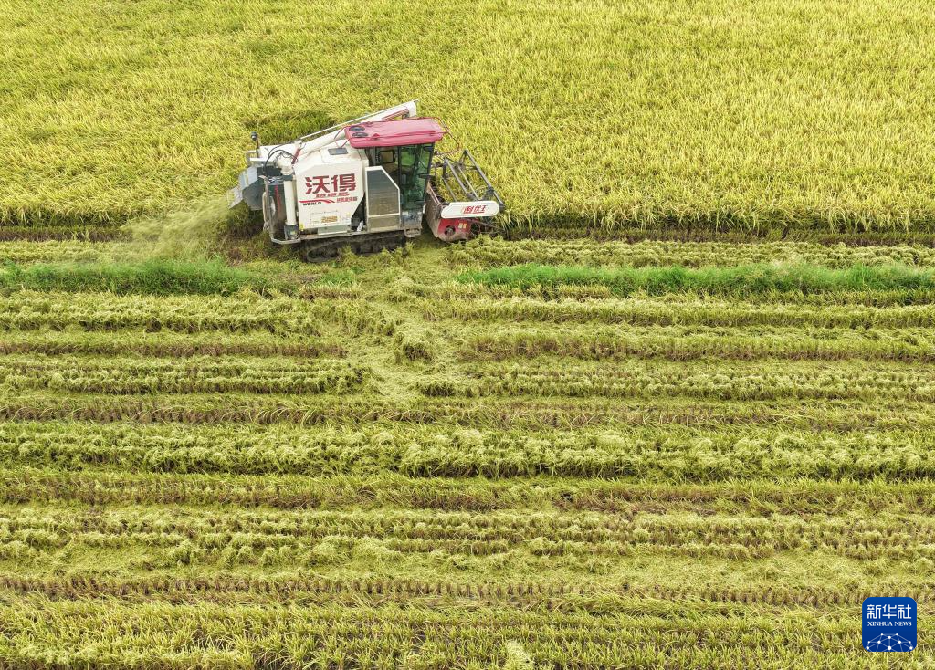 8月7日,在湖南省永州市道縣壽雁鎮社下村,農民駕駛農機收割水稻(無人機照片)。