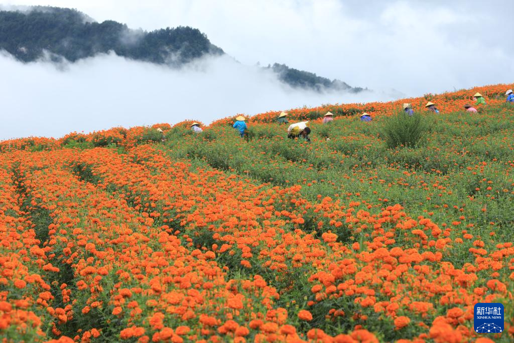 8月7日,在云南騰沖市固東鎮,農民采收萬壽菊。