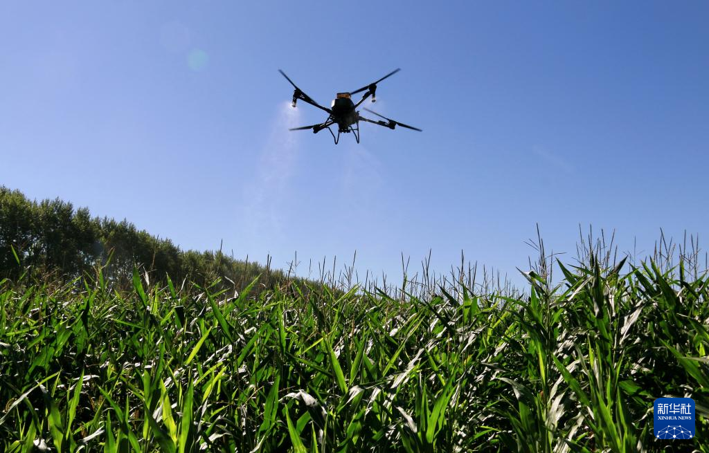 8月7日,在北大荒集團黑龍江格球山農場有限公司第二管理區,一架植保無人機為玉米噴施“營養液”。