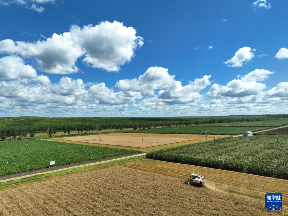 8月7日,在黑龍江省農墾科學院九三科創中心,一臺收割機在小麥繁殖田進行收獲作業(無人機照片)。