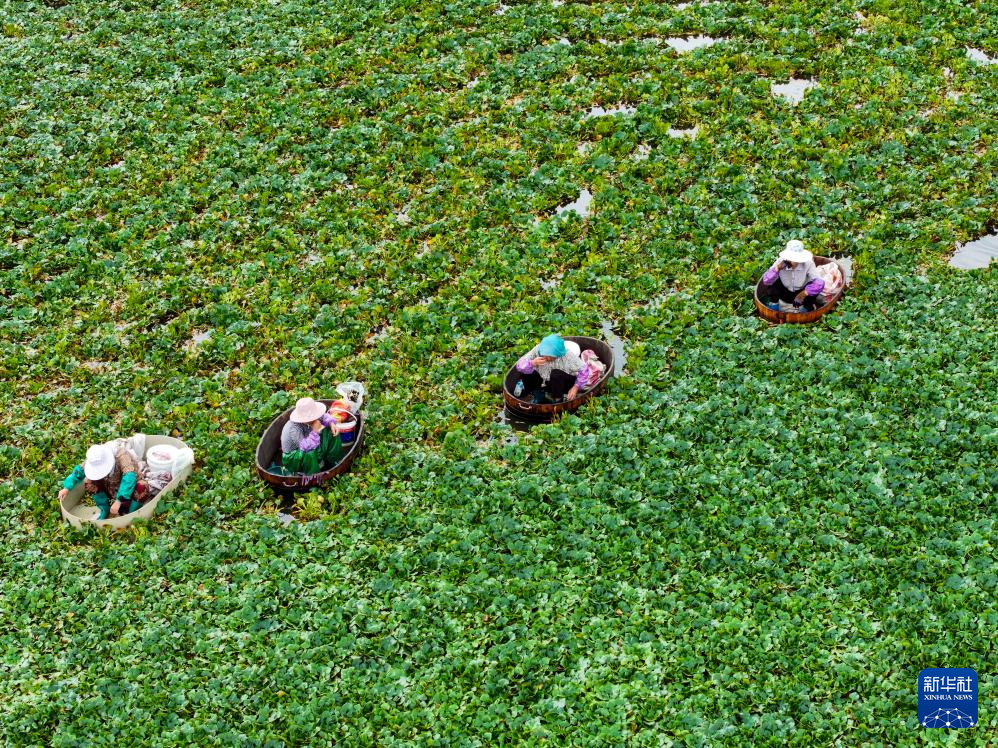 8月7日,江蘇省泰州市海陵區蘇陳鎮張家院社區農民在菱塘采摘菱角(無人機照片)。