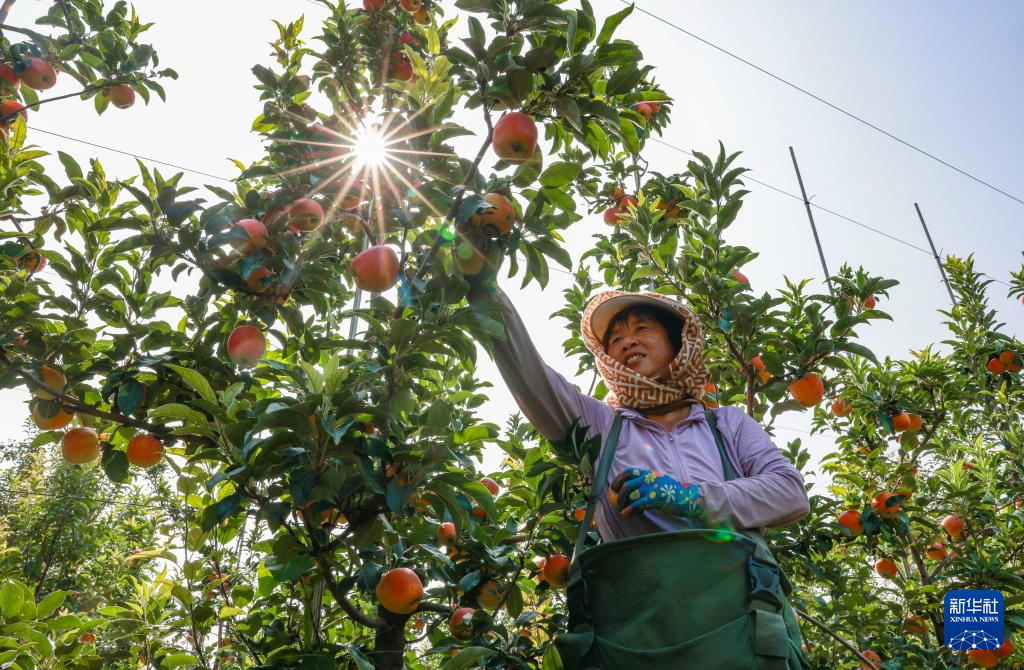 8月7日,果農在山東省東營市廣饒縣大王鎮的一處蘋果種植基地內采摘蘋果。